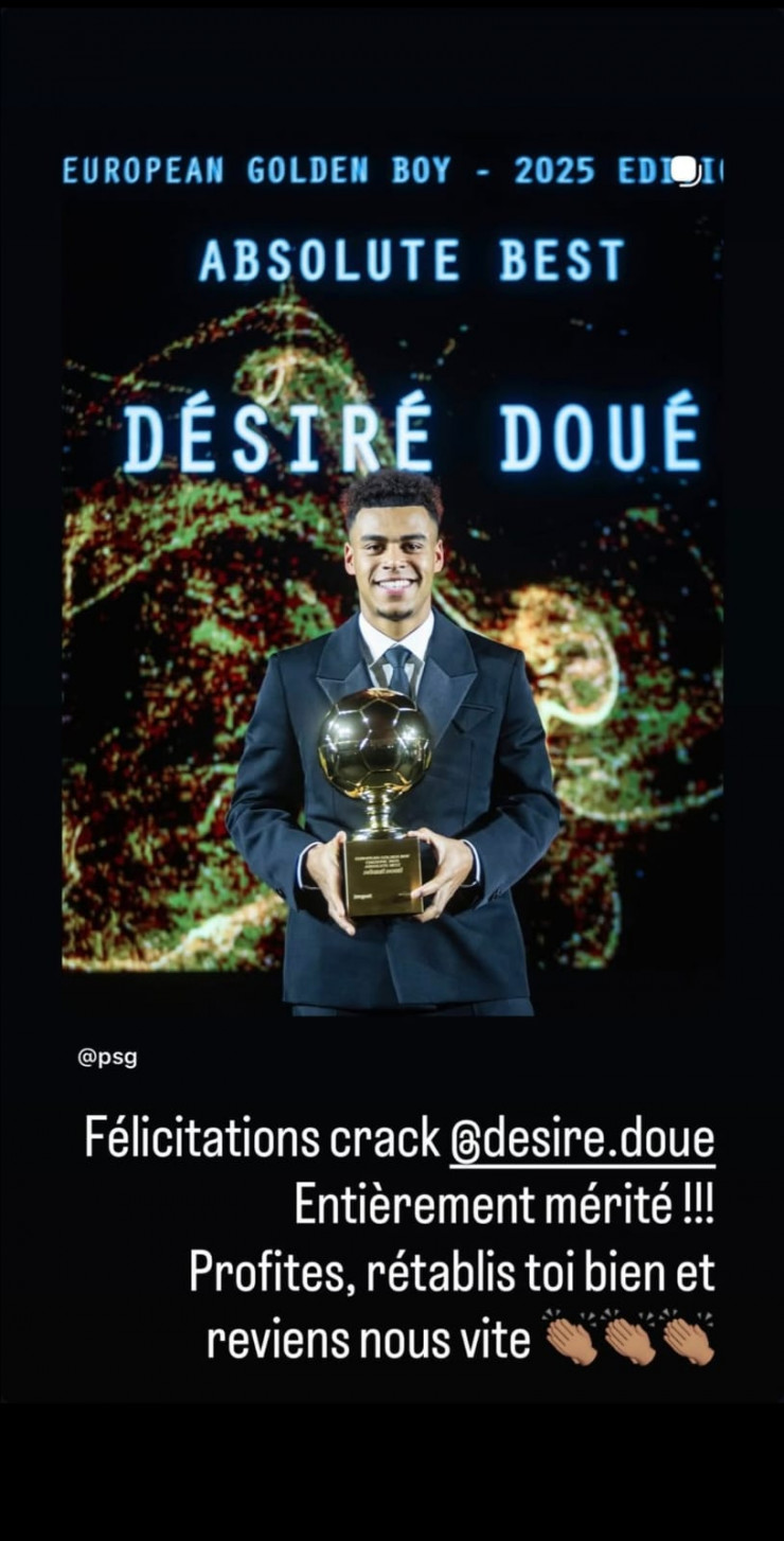 "Поздравления, звезда. Абсолютно заслуженно! Наслаждайся, выздоравливай и возвращайся к нам поскорее", — написал Мбаппе на своей странице в социальной сети.