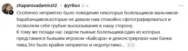 Особенно неприятно было поведение некоторых болельщиков - мальчиков-барабанщиков, которые не давали нам спокойно сфотографироваться и позволяли себе грубые высказывания в нашу сторону. К тому же позади нас сидели пьяные болельщики, один из которых представился бывшим игроком "Кайсара" и демонстрировал нам банки пива. Это было крайне неприятно и недопустимо", - поделилась она в соцсети Threads.