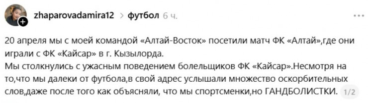 "20 апреля мы с моей командой "Алтай-Восток" посетили матч ФК "Алтай", где они играли с ФК "Кайсар" в городе Кызылорде. Мы столкнулись с ужасным поведением болельщиков ФК "Кайсар". Несмотря на то, что мы далеки от футбола, в свой адрес услышали множество оскорбительных слов, даже после того, как объясняли, что мы спортсменки, но гандболистки.