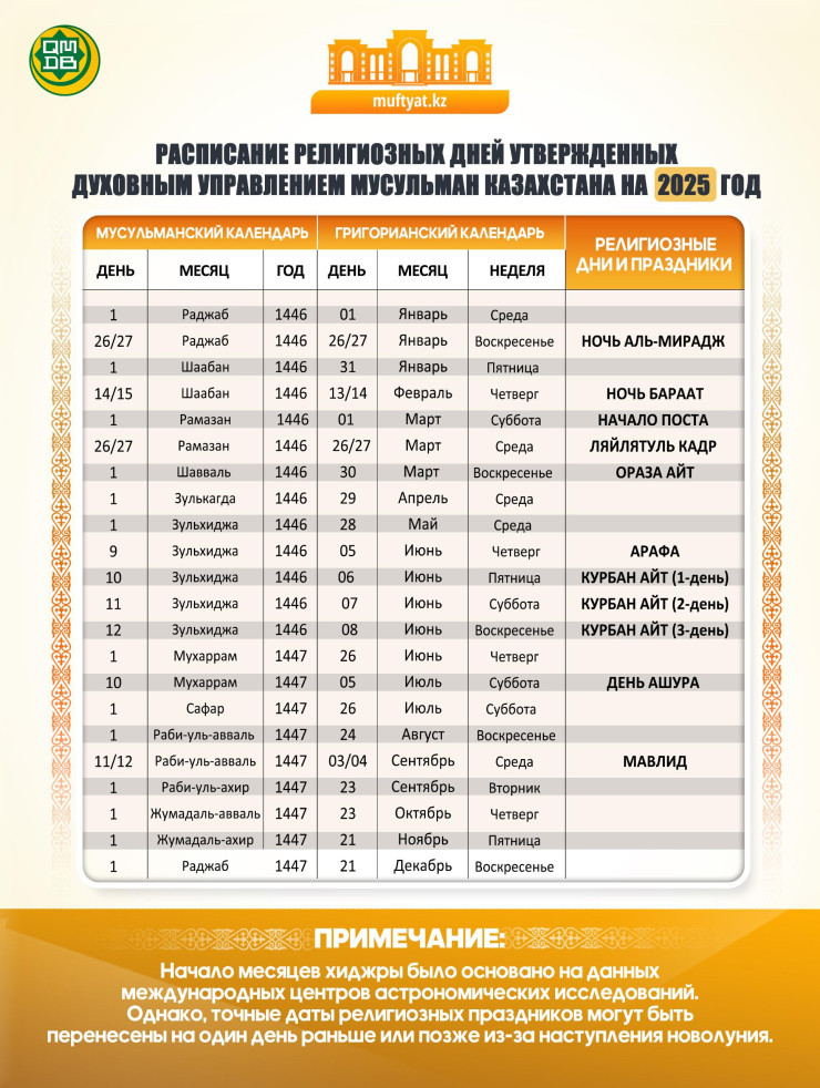 В ДУМК (Духовное управление мусульман Казахстана) предупреждают, что даты исламских праздников могут измениться в зависимости от новолуния.