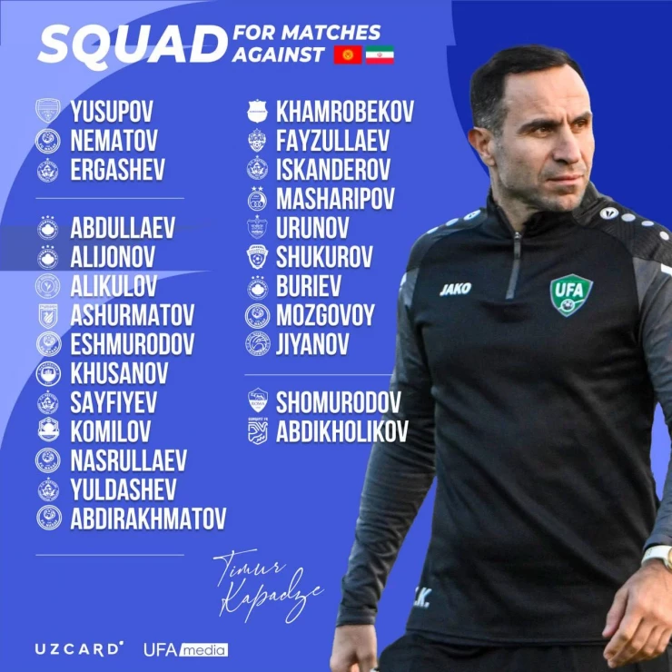Команда под руководством Тимура Кападзе начнет тренировочный сбор 17 марта. В рамках отборочного турнира Узбекистан сыграет с Кыргызстаном 20 марта в Ташкенте, а 25 марта - на выезде против Ирана.