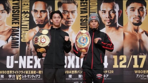 На арене Kokugikan в Токио (Япония) завершился в объединительный бой первого наилегчайшего веса, в котором встретились местный чемпион WBA Кесуке Таками (10-1, 8 KO) и обладатель титула WBO Рене Сантьяго из Пуэрто-Рико (15-4, 9 KO), сообщают Vesti.kz.