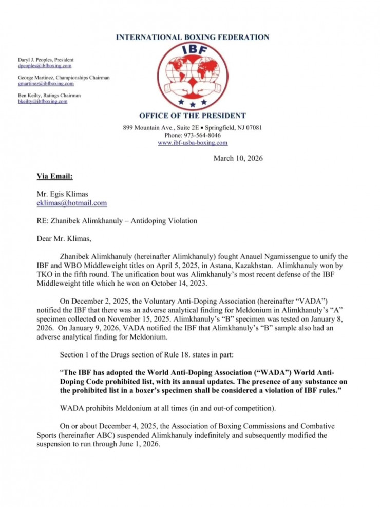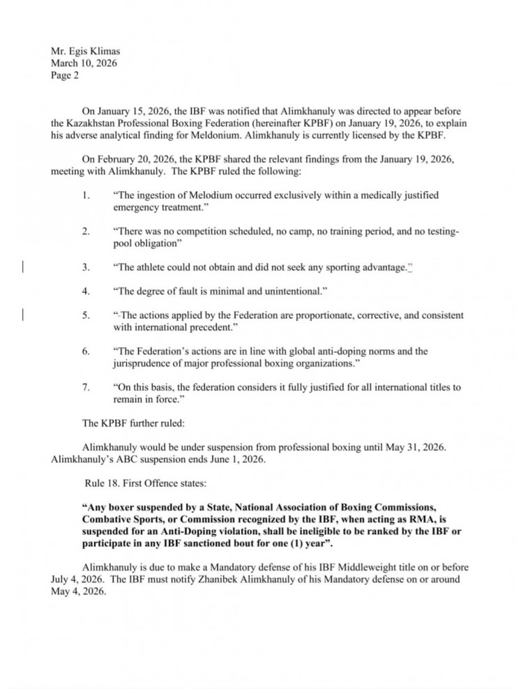 "Правило 18. Первое нарушение гласит: "Любой боксёр, отстранённый штатом, национальной ассоциацией боксёрских комиссий, органом по боевым видам спорта или комиссией, признанной IBF, действующей в качестве RMA, за нарушение антидопинговых правил, не имеет права быть включённым в рейтинг IBF или участвовать в любом бою, санкционированном IBF, в течение одного года". Алимханулы должен провести обязательную защиту своего титула чемпиона мира IBF в среднем весе не позднее 4 июля 2026 года. IBF обязана уведомить Алимханулы о его обязательной защите не позднее примерно 4 мая 2026 года.