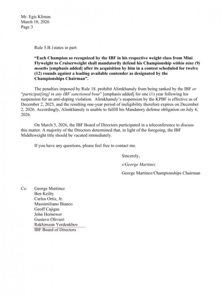 5 марта 2026 года Совет директоров IBF провёл телеконференцию для обсуждения данного вопроса. Большинство директоров пришло к выводу, что, учитывая вышеизложенное, титул чемпиона мира IBF в среднем весе должен быть немедленно объявлен вакантным", — говорится в официальном письме IBF.
