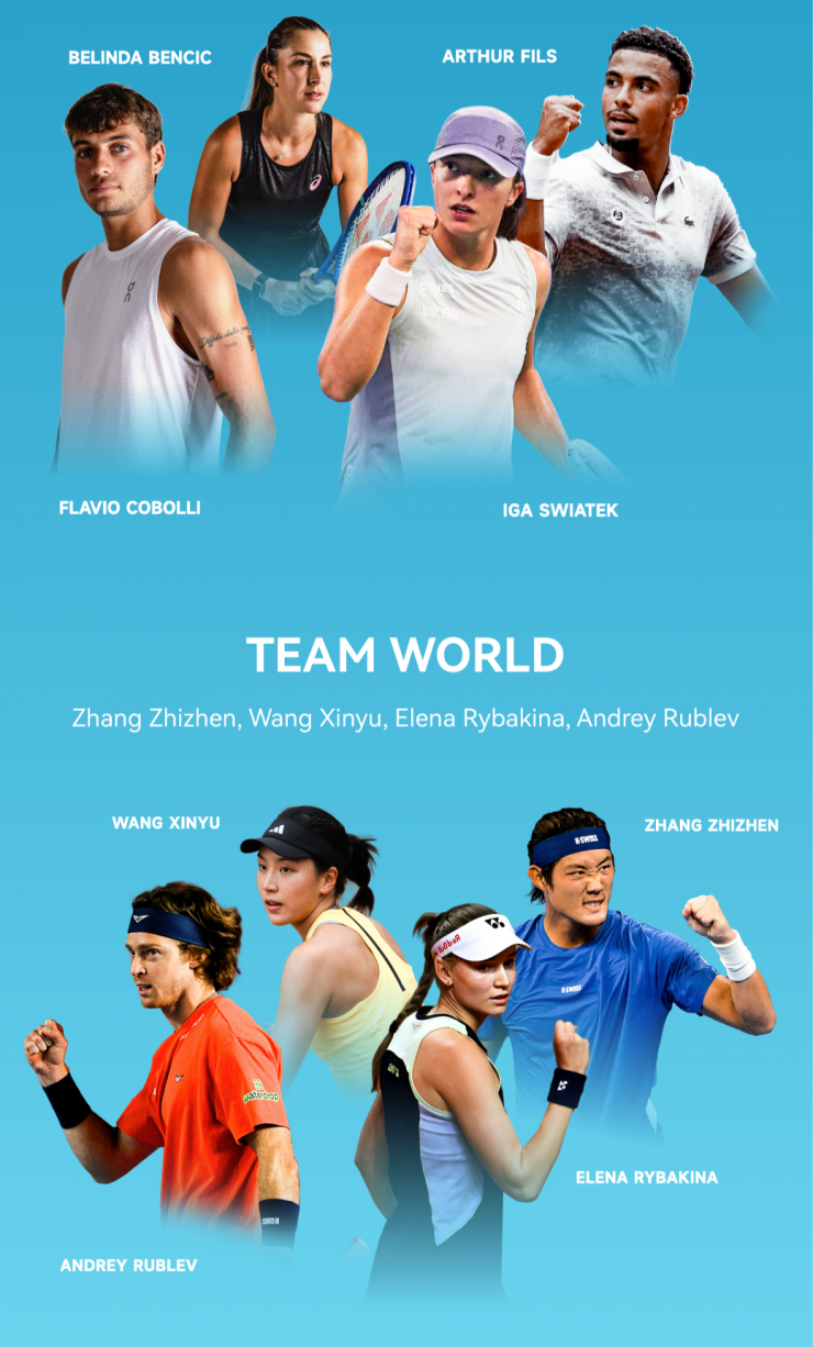А вот за команду мира будут играть казахстанка Рыбакина, россиянин Андрей Рублёв (№16), а также китайские спортсмены Синьюй Ван (№56) и Чжичжэнь Чжан (№414).